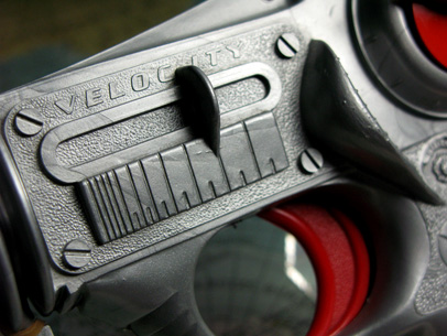 I'm not exactly sure what the designers were thinking when they came up with the Atomic Ray, but the sculpted handle is scaled to fit comfortably in an adult-sized hand -- slightly odd at the time, but perfect for today's collector! The gun features an abundance of rings and molded gadgetry, as well as two non-functional, free-spinning knobs on either side.